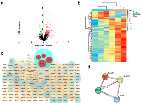 In order to explore the effects of chitosan hydrogel supplemented with metformin and growth factors on the neural differentiation of stem cells, proteomics was used to construct the protein profiles to analyze the fluctuations of protein abundance after neural differentiation in GMSCs. The results showed that a total of 2230 proteins were detected by label–free proteomics (Figure 6a). The results of the difference analysis showed that, compared with GMSCs, a total of 213 differential abundance proteins (DAPs) were found and identified in nerve–like cells under 3D hydrogel conditions (Figure 6b), of which 181 were upregulated (Supplementary Table S1) and 32 were downregulated (Supplementary Table S2). To understand the social relationship of DAPs, we analyzed the protein–protein interaction network. It was found that there is a complex interaction network relationship in DAPs (Figure 6c), and a high–scoring sub–network was found, including ATP5F1, ATP5J, NDUFS3, and GLUD1 (Figure 6d). Protein–protein interactions were performed via Cytoscape. All subnetworks and scores are available in Supplementary Table S3.