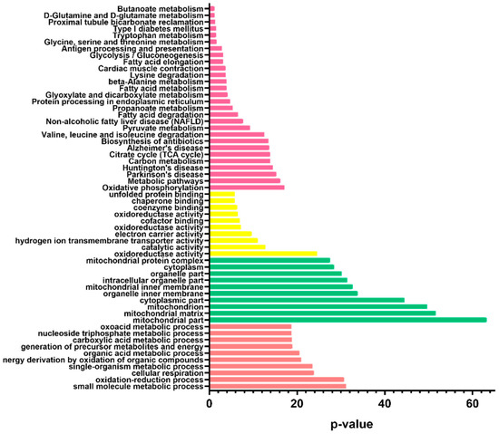 To interpret the biological functions and pathways of DAPs, we performed GO and KEGG analyses (Figure 7). The results showed that DAPs were involved in important biological processes, including a small molecule metabolic process, an oxidation–reduction process, cellular respiration, a single–organism metabolic process, energy derivation by oxidation of organic compounds (p < 0.001), an organic acid metabolic process, the generation of precursor metabolites and energy, a carboxylic acid metabolic process, a nucleoside Triphosphate metabolic process, and an oxoacid metabolic process. These molecules are mainly located in mitochondrial part, mitochondrial matrix, mitochondrion, cytoplasmic part, organelle inner membrane, mitochondrial inner membrane, intracellular organelle part, organelle part, cytoplasm, and mitochondrial protein complex. It was found that the main molecular functions of these proteins include oxidoreductase activity, catalytic activity, hydrogen ion transmembrane transporter activity, electron carrier activity, oxidoreductase activity, acting on the aldehyde or oxo group of donors, NAD or NADP as a acceptor, cofactor binding, oxidoreductase activity, acting on the aldehyde or oxo group of donors, coenzyme binding, chaperone binding, and unfolded protein binding. A total of 28 pathways were discovered here, with p < 0.001. It was found that a subset of high scores, including for ATP5F1, ATP5J, NDUFS3, and GLUD1, was involved in neural nucleus development. In summary, the results of proteomics showed that neural differentiation involved complex protein interactions, and metformin upregulates multiple proteins that promote neurogenesis, including ATP5F1, ATP5J, NDUFS3, and GLUD1 (Figure 6d).