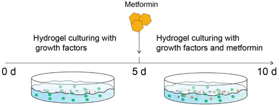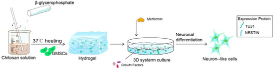 In the process of preparing chitosan hydrogel, we dissolved β–glycerophosphate sodium in water containing the growth factor, and we stirred and mixed it with the chitosan solution in an ice–water bath at a volume ratio of 1:9. The prepared chitosan hydrogel was stored in an ice–water bath, and the final growth factor concentration was 10 ng/mL. We then took the GMSCs cultured in the T25 culture flask, discarded the medium, washed twice with PBS, digested with trypsin, stopped the digestion with complete medium, centrifuged at 1000 rpm for 5 min, resuspended the cells in PBS, and mixed with hydrogel with a volume ratio of 1:3 on an ice–water bath. Then we inoculated them into a 24–well plate. We placed them in a 37 °C incubator, and they solidified after a few minutes. In order to maximize the neurological differentiation of GMSCs, we used the method of segmented induction. In the first 5 days of culture, we added complete medium to the hydrogel, and then we added complete medium containing metformin for the next five days, called the Met group (Scheme 2.) The hydrogel group refers to a hydrogel culture system that does not add metformin and is inoculated with the same amount of cells. The blank group refers to a complete medium without growth factors, metformin, and hydrogel. The inoculum amount and induction time were the same as those of the other two groups, both were 14 days, and the medium was changed every 2 days. The GMSCs in a 3D cellular culture hydrogel containing metformin and growth factor are termed the Met–CS groups and the GMSCs cultured in a hydrogel without metformin and growth factors are termed the CS groups.