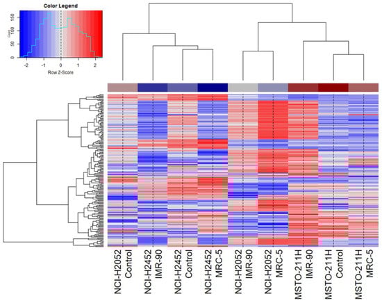 Unsupervised clustering of treated cell lines and controls. MPM cell lines (NCI−H2052, NCI−H2452, and MSTO−211H) were treated with conditioned medium of fibroblast cell lines IMR-90 or MRC-5. In controls, conditioned medium of the respective MPM cell line itself was used.