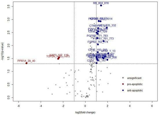 Moreover, enhanced apoptotic rates are associated with the phosphorylation of multiple phosphosites (Figure 2, linear regression model). Altogether, 39 phosphosites were associated with significant elevation of apoptotic rates. Increased phosphorylation of 36 phosphosites in 32 protein targets including RB, ARAF, AKT1, FAK2, etc. (Supplementary Table S2, showing positive Rho, spearman test) was associated with elevated apoptotic rates (Figure 2). Contrarily, phosphorylation of EPB42, STK6, and CREB was decreased and thus associated with increased apoptosis (Supplementary Table S2, showing negative Rho, spearman test).