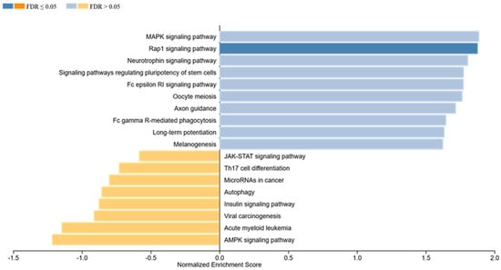 GSEA revealed highly significant associations with the Rap1 signaling pathway (p ≤ 0.001, normalized enrichment score: 1.88), Oocyte meiosis (p ≤ 0.001, normalized enrichment score: 1.77), the Fc epsilon RI signaling pathway (p ≤ 0.001, normalized enrichment score: 1.78), the MAPK signaling pathway (p = 0.003, normalized enrichment score: 1.89), the Neurotrophin signaling pathway (p ≤ 0.001, normalized enrichment score: 1.81), the signaling pathways regulating pluripotency of stem cells (p = 0.002, normalized enrichment score: 1.78), Long-term potentiation (p = 0.009, normalized enrichment score: 1.64) and Axon guidance (p = 0.005, normalized enrichment score: 1.72). Furthermore, significant enrichment has been calculated for the Fc gamma R-mediated phagocytosis (p = 0.013, normalized enrichment score: 1.65) and Melanogenesis (p = 0.032, normalized enrichment score: 1.63). The mentioned pathways all show activation in MPM cell lines treated with FB CM (Figure 3).