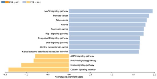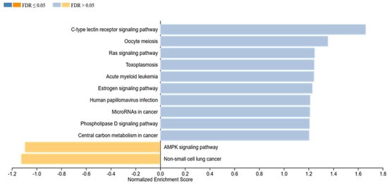 Concerning induction of apoptosis, our calculations result in highly significant enrichment of the MAPK signaling pathway (p = 0.003, normalized enrichment score: 1.96), Prostate cancer (p ≤ 0.001, normalized enrichment score: 1.88), Glioma (p = 0.009, normalized enrichment score: 1.79), and Tuberculosis (p = 0.004, normalized enrichment score: 1.82) (Figure 4). Furthermore, significant enrichment has been calculated for the Rap1 signaling pathway (p = 0.016, normalized enrichment score: 1.75), Pancreatic cancer (p = 0.020, normalized enrichment score: 1.76), Choline metabolism in cancer (p = 0.037, normalized enrichment score: 1.65), Kaposi-sarcoma-associated herpesvirus infection (p = 0.032, normalized enrichment score: 1.64), ErbB signaling pathway (p = 0.023, normalized enrichment score: 1.66), and Fc epsilon RI signaling pathway (p = 0.018, normalized enrichment score: 1.66). Activation of all of those pathways is significantly associated with increased levels of apoptosis (Figure 4). Moreover, the C-type lectin receptor signaling pathway (p = 0.005, normalized enrichment score: 1.66) was enriched in association to elevated cell viability (Figure 5).