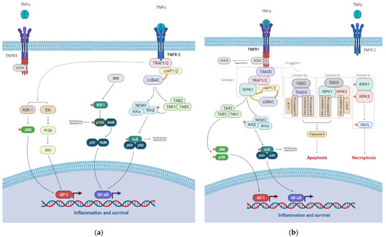 TNFR1 and TNFR2 present different intracellular domains [50] that can interact with common and diverse downstream signaling molecules [47]. Figure 1 illustrates the TNFR1 and TNFR1 signaling pathways. The role of each receptor is context-dependent and can also be cell or tissue specific.