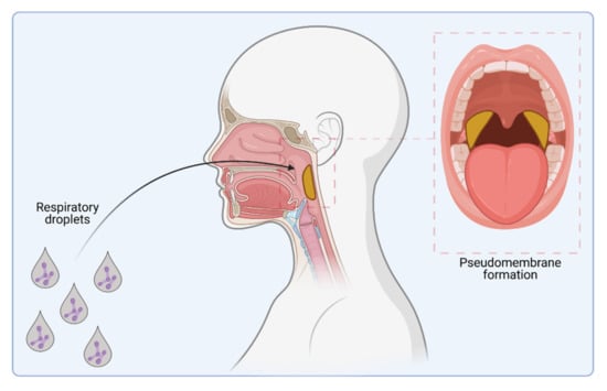 C. diphtheriae infection. Infection pathway by respiratory droplets and pseudo-membrane formation (indicated in yellow) caused by colonization of the upper respiratory tract (figure created with BioRender.com).