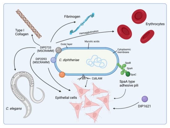 To date, three proteins—DIP0733, DIP2093, and CDCE8392_081—are known to play a major role in host cell invasion by C. diphtheriae and establishment of the bacteria in the body [40,41,51,52].