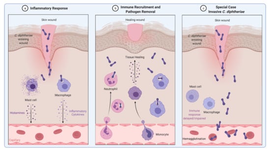 Inflammatory response induced by C. diphtheriae. (a,b) Inflammatory response caused by non-invasive C. diphtheriae. Entering bacteria lead to recruitment of immune cells such as neutrophils and macrophages and removal of the pathogen. (c) Invasive C. diphtheriae remain undetected by the host immune system through unknown mechanisms, gain access to deeper tissues and blood vessels, and spread through the whole body by binding erythrocytes (hemagglutination) (figure created with BioRender.com).