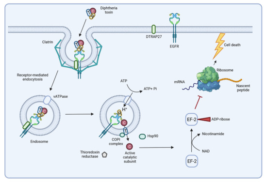 In the un-cleaved form, the toxin is inactive and may be distributed to different organs when secreted into the bloodstream. The subsequent delivery of DT to the cytosol of a target cell depends on binding to the toxin receptor HB-EGF of the host cell, which is supported by the diphtheria toxin receptor-associated protein 27 (DTRAP 27) [70,76]. Receptor-mediated endocytosis of the complex by the host cell is followed by an acidification of the endosome due to the activity of a vacuolar (v)ATPase [70]. Acidification induces unfolding of the translocation domain and its insertion into the endosomal membrane, where it forms a pore with a diameter of approximately 20 Å [77,78]. After cleavage of the toxin, the catalytic domain is released into the cytosol through the pore of the translocation domain. The translocation process involves cellular proteins such as the COPI complex and a cytoplasmic thioredoxin reductase [70], while refolding of the catalytic domain and activation of its ADP ribosyltransferase activity is supported by the Hsp90 chaperone. Subsequently, the catalytic domain ADP ribosylates elongation factor 2 (EF-2) of the host cell. This leads to an inhibition of the protein synthesis by the ribosome and apoptosis is induced [74,79] (Figure 5). A single toxin molecule is sufficient to stop protein synthesis of a cell and a toxin concentration of 0.1 μg per kg body weight is lethal for humans [9,75].