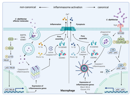 In addition to caspase-1, caspase-4 and -5 may provide an alternative mechanism of inflammasome activation by some Corynebacterium species, which also leads to cleavage of gasdermin D followed by pore formation and pyroptosis (Figure 7). Caspase-1-dependent inflammasome activation is known as canonical way, and the caspase-4/5-dependent process is termed non-canonical. The term “canonical pathway” refers to idealized or generalized pathways describing common properties of a particular signaling module or pathway, while “non-canonical pathway” refers to a less known or alternative pathway [92,93]. It is remarkable that some C. diphtheriae strains induce both pathways and others do not, which has to be further characterized. It is also worth to mention that caspase-4/5-dependent inflammasome activation and pyroptosis do not lead to IL-1β secretion, since pro-IL-1β can only be processed to active IL-1 β by caspase-1 [94]. The complex process of canonical and non-canonical inflammasome activation, which seems to be induced by corynebacteria is depicted in Figure 8. The involvement of caspase-4/5 and IL-1α in response to C. diphtheriae infection is hypothetical and needs to be clarified in future experiments.