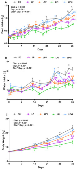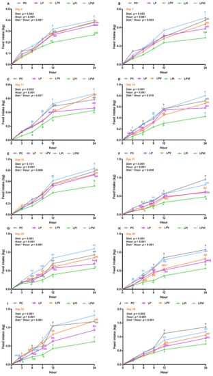 Overall, the effects of diet, hour, and the interaction of diet by hour were significant on hourly FI on days 4, 7, 11, 14, 21, 25, 28, 32, and 35 (Figure 2A–J). On days 4, 11, 14, 21, 25, 28, 32, and 35 FI was lower in LPI than LPVI at hours 12 and 24. Relative to LP and LPI, FI increased in LPVI on days 25, 28, and 32 at hours 12 and 24 (Figure 2G–I). Further, LPVI had a higher FI than LP on day 14 at hour 24 (Figure 2D). While LP had lower FI than PC at hour 24 on day 21 (Figure 2F), hour 12 of days 28 and 32 (Figure 2H,I), and hours 12 and 24 of day 35 (Figure 2J), no differences in FI were detected between PC and LPVI on these days and hours.