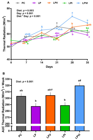 Overall, the effects of diet, day, and the interaction of diet by day on thermal radiation were significant (Figure 3A; p < 0.01). No significant differences were detected when thermal radiation of PC and LP were compared (Figure 3A). Relative to LPI, LPVI tended to increase the thermal radiation on day 7 and significantly increased the thermal radiation on day 28 and 35 (Figure 3A; p < 0.01). Compared to LP, LPVI tended to increase the thermal radiation on days 14 and 21 and increased that significantly on days 28 and 35 (Figure 3A). LPVI also increased the thermal radiation on days 28 and 35 relative to PC. LPV had higher thermal radiation on day 35 when compared with LP. The effect of diet on the area under the curve (AUC) of thermal radiation was significant (Figure 3B; p < 0.01). Relative to LP and LPI, the AUC thermal radiation was significantly higher in LPVI (Figure 3B; p < 0.01). Furthermore, the AUC thermal radiation tended to increase in LPVI in comparison with PC. LPV tended to have a higher AUC thermal radiation than LP (Figure 3B).