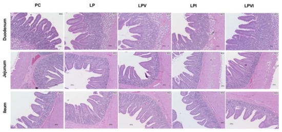 Representative intestinal hematoxylin and eosin-stained sections (×10 magnification) micrographs of duodenum, jejunum, and ileum in pigs fed with very-low-protein diets supplemented with Ile, Val, or combination of both. PC (positive control): standard-protein diet; LP (negative control): low-protein diet containing limiting amino acids (i.e., Lys, Met, Thr and Trp) at NRC (2012) levels; LPV: LP containing Val at NRC level; LPI: LP containing Ile at NRC level; LPVI: LP containing Val and Ile at NRC levels. n = 8.