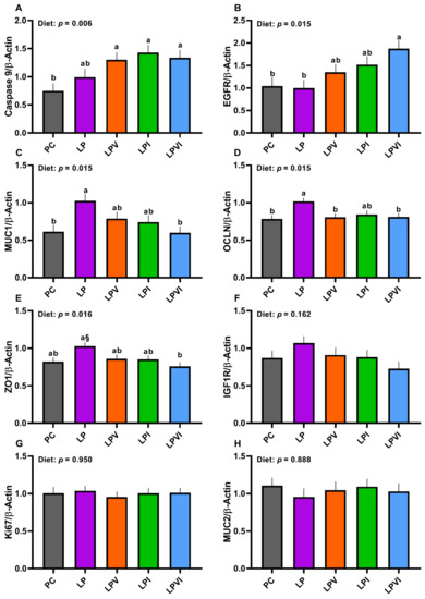 Overall, the effect of diet on the gene expression of duodenal Caspase 9, epidermal growth factor receptor (EGFR), mucin 1 (MUC1), occludin (OCLN), and zonula occludens 1 (ZO1) was significant (Figure 5A–E). The mRNA abundance of Caspase 9 was not different between PC and LP diets, but LPVI, LPV, and LPI increased that relative to PC (Figure 5A; p < 0.01). The gene expression of EGFR was not different between PC and LP, but the gene expression of EGFR was greater in LPVI than PC and LP (Figure 5B; p = 0.015). In comparison with PC, the gene expression of duodenal MUC1 was increased in LP (Figure 5C; p = 0.015). However, the mRNA abundance of MUC1 was not different for LPVI, LPV and LPI vs. PC and that was lower for LPVI than LP. Compared with PC, duodenal transcript of OCLN was higher in LP (Figure 5D). However, the transcript of OCLN was not different for LPVI, LPV, and LPI vs. PC and that was lower for LPV and LPVI than LP. Relative to PC, the mRNA abundance of ZO1 tended to be higher in LP (Figure 5E). The mRNA abundance of ZO1 was not different for LPVI, LPV, and LPI vs. PC and that was lower for LPVI than LP. No differences among treatments were detected for the mRNA abundance of duodenal insulin-like growth factor-1 receptor (IGF1R) (Figure 5F), Ki67 (Figure 5G), and mucin 2 (MUC2) (Figure 5H).