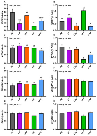 Hepatic mRNA abundance of (A) insulin-like growth factor-1 (IGF1), (B) insulin-like growth factor binding protein 1 (IGFBP1), (C) activating transcription factor 4 (ATF4), (D) peroxisome proliferator-activated receptor gamma (PPARγ), (E) protein kinase C alpha (PRKCA), (F) casein kinase 2 alpha 1 (CSNK2A1), (G) general control non-derepressible-2 (GCN2), and (H) mechanistic target of rapamycin (mTOR), in nursery pigs fed with very-low-protein diets supplemented with Ile, Val, or combination of both. PC (positive control): standard-protein diet; LP (negative control): low-protein diet containing limiting amino acids (i.e., Lys, Met, Thr and Trp) at NRC (2012) levels; LPV: LP containing Val at NRC level; LPI: LP containing Ile at NRC level; LPVI: LP containing Val and Ile at NRC levels. The values are means ± standard error of the mean. n = 8. a,b,c Among groups, the means with different superscript letter(s) are different (p ≤ 0.05). # p ≤ 0.1 LPVI vs. PC, ɸ p ≤ 0.1 LPVI vs. LPV, $ p ≤ 0.1 LPI vs. LP.