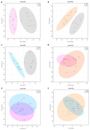 Principal component analysis (PCA) score plots of plasma metabolites in nursery pigs fed with very-low-protein diets supplemented with Ile, Val, or combination of both. (A) LP vs. PC, (B) LPV vs. PC, (C) LPVI vs. PC, (D) LPV vs. LP, (E) LPVI vs. LP, and (F) LPVI vs. LPV. PC (positive control): standard-protein diet; LP (negative control): low-protein diet containing limiting amino acids (i.e., Lys, Met, Thr and Trp) at NRC (2012) levels; LPV: LP containing Val at NRC level; LPI: LP containing Ile at NRC level; LPVI: LP containing Val and Ile at NRC levels. Each shape represents a pig. n = 8.