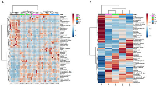 Heatmap analysis of plasma metabolites in nursery pigs fed with very-low-protein diets supplemented with Ile, Val, or combination of both. Hierarchical clustering of the top 50 significant plasma metabolites among: (A) individual pigs and (B) pigs fed with PC, LP, LPI, LPV, and LPVI. PC (positive control): standard-protein diet; LP (negative control): low-protein diet containing limiting amino acids (i.e., Lys, Met, Thr and Trp) at NRC (2012) levels; LPV: LP containing Val at NRC level; LPI: LP containing Ile at NRC level; LPVI: LP containing Val and Ile at NRC levels. The metabolites are shown in rows, and pigs or experimental groups are shown in columns (Figure 8A,B, respectively). The dark red or blue is corresponding to the magnitude of difference when compared with the average value. The dendrogram on the left side of the heatmap shows both the similarity and the order that the clusters were formed. n = 8.