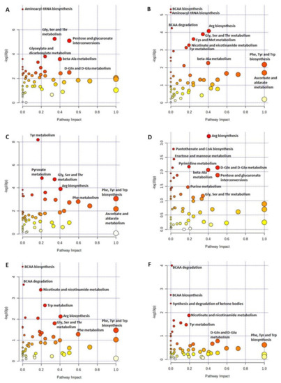 Pathway analysis map of plasma metabolites in nursery pigs fed with very-low-protein diets supplemented with Ile, Val, or combination of both. (A) LP vs. PC, (B) LPV vs. PC, (C) LPVI vs. PC, (D) LPV vs. LP, (E) LPVI vs. LP, and (F) LPVI vs. LPV. PC (positive control): standard-protein diet; LP (negative control): low-protein diet containing limiting amino acids (i.e., Lys, Met, Thr and Trp) at NRC (2012) levels; LPV: LP containing Val at NRC level; LPI: LP containing Ile at NRC level; LPVI: LP containing Val and Ile at NRC levels. Each circle is obtained from topology analysis representing a metabolic pathway with the scores. The x-axis indicates the pathway impact, and the y-axis shows the pathway enrichment. The circle size depends on its impact while its color is based on its p value (i.e., greater circle size shows higher pathway impact, while darker color circles demonstrate more significant changes of metabolites and pathway enrichment). n = 8.