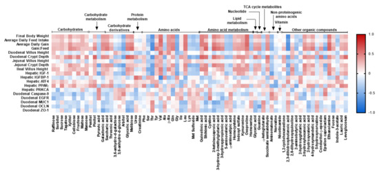 Pearson correlation analysis between significantly changed plasma metabolites, growth performance, gut morphology, and gene expression of markers associated with gut development and hepatic IGF-1 signaling pathway in nursery pigs fed with very-low-protein diets supplemented with Ile, Val, or combination of both. The color of the squares is based on the Pearson coefficient distribution: red represents a positive correlation (p ≤ 0.05), blue represents a negative correlation (p ≤ 0.05), and white is indicative of a non-significant correlation (p > 0.05). IGFBP1: insulin-like growth factor binding protein 1; ATF4: activating transcription factor 4; PPARγ: peroxisome proliferator-activated receptor gamma; PRKCA: protein kinase C alpha; EGFR: epidermal growth factor receptor; MUC1: mucin 1; OCLN: occludin; ZO1: zonula occludens 1. n = 8.
