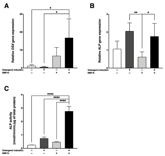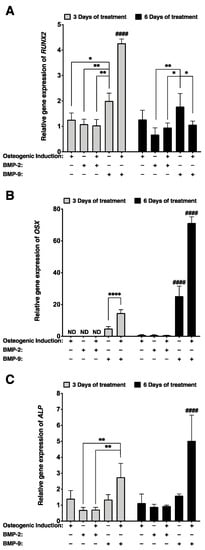 2.1. Better Osteogenic Differentiation Is Achieved When Monolayer Cultures of Osteogenically Induced hASCs Are Treated with rhBMP-9 Compared with rhBMP-2