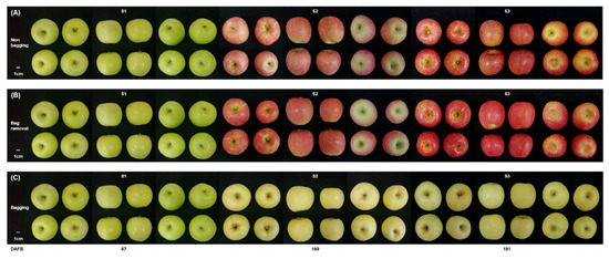 The role of bag treatment in the red-striped ‘Fuji’ fruit was examined. Three groups were analyzed in this study: fruit labeled as “non-bagging” were not subjected to paper-bagging; fruit labeled “bag removal” were paper-bagged, and then the bag was removed; fruit labeled as “bagging” were paper-bagged, but the bag was not removed. In the bag removal group, the fruit color changed to red-blushed skin, whereas bagging fruit stayed light yellow (Figure 1).