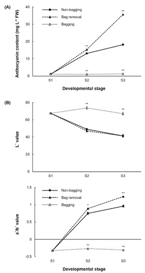 Because paper-bagging induces a change in skin color and pattern, L*, a*, and b* values were calculated over the entire surface of fruit skins using the Tomato Analyzer software (Figure 2B). L* and a*/b* values represent lightness and redness, respectively. A pattern similar to previous anthocyanin content was seen in L* and a*/b* data. Specifically, the L* value was significantly higher in bagging fruit, and the a*/b* value was higher in bag removal fruit.