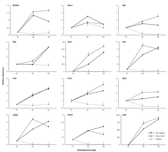 The anthocyanin pathway in apple consists of regulatory (MdMYB10, MdbHLH, and MdWD), structural (MdPAL, MdCHS, MdCHI, MdF3H, MdF3′H, MdDFR, MdLDOX, and MdUFGT), and transport (MdGST) genes (Figure S1). We measured and analyzed the expression levels of these genes during fruit color development by quantitative real-time PCR. The findings for bag removal and bagging fruit were compared to those for non-bagging fruit (Figure 3). The expression levels of anthocyanin-related genes in bag removal and non-bagging fruit show similar trends. Most genes were upregulated from S1 to S3 and peaked at S3, but most genes in bagging fruit display opposite expression patterns because bagging fruit do not accumulate anthocyanin due to a lack of light exposure. In bag removal fruit, regulatory genes MdMYB10, MdWD, and MdGST and all structural genes were significantly upregulated by re-exposure to light. The most significant difference appears in MdMYB10 expression. Although MdPAL, MdCHI, MdF3H, MdLDOX, and MdUFGT expression levels are lower than non-bagging fruit, expression levels of MdPAL, MdCHI, and MdF3H are similar at S3. In bagging fruit, most regulatory and structural genes were hardly expressed.