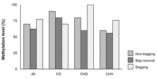 At least ten clones for each bag treatment were used to analyze the cytosine methylation level of the M7 region at the mature stage. There is no sequence difference in the three bag treatment groups except for a few sequencing errors and then a total methylated cytosine and three cytosine contexts (i.e., CG, CHG, and CHH) were detected by bisulfite sequencing (Figure 5). The results show that the total methylation level was lower in bag removal fruit (62.5%) than non-bagging fruit (70.0%) followed by bagging fruit (77.5%). This methylation pattern is similar to CHG and CHH patterns except for the CG pattern, where the methylation level was higher in non-bagging fruit than bag removal fruit followed by bagging fruit. In particular, the CHG pattern exhibited the greatest difference in the three bag treatment groups with an average of 60.0% in bag removal fruit, followed by non-bagging fruit (80.0%) and bagging fruit (100.0%).