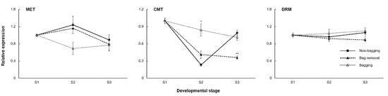 DNA methyltransferases mediate the partial DNA methylation observed in the MdMYB10 promoter. Quantitative real-time PCR was conducted to measure MdMET, MdCMT, and MdDRM expression levels in the three bag treatment groups throughout the coloring period. The findings for bag removal and bagging fruit were compared to those for non-bagging fruit (Figure 6). MdMET expression level in bag removal and non-bagging fruit displays a similar trend from S1 to S3. MdMET is upregulated from S1 to S2 and downregulated in S3. MdMET expression in bag removal fruit is lower than in non-bagging fruit, although the difference did not reach statistical significance. MdCMT and MdDRM expression levels in bag removal and non-bagging fruit display similar trends from S1 to S2. MdCMT and MdDRM genes are downregulated from S1 to S2. At S3, MdCMT and MdDRM expression is significantly downregulated in bag removal fruit and upregulated in non-bagging fruit. No consistent pattern between bagging and non-bagging fruit is observed, and differences do not reach statistical significance. Although MdMET expression is lower in bagging fruit than non-bagging fruit, it peaks at S3 when the expression in bag removal fruit is downregulated. Overall, expression levels of MdCMT and MdDRM in the bagging group are higher than in non-bagging and bag removal groups.