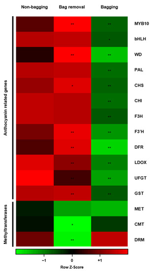 Heat map analysis for expression levels of anthocyanin- and methylation-related genes in mature ‘Fuji’ apples cultivated under different bag treatments: no bagging (control; labeled as “non-bagging”), bagging followed by bag removal (labeled as “bag removal”), and bagging with no bag removal (labeled as “bagging”). The color scale at the bottom shows a log2-transformed gene expression level from −1 (green), through 0 (black), to +1 (red) that represents low, intermediate, and high expression levels. * and ** indicate significance levels of p < 0.05 and p < 0.01, respectively.
