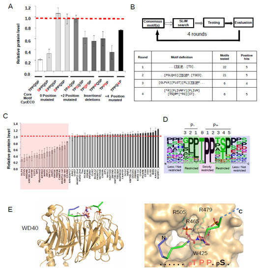 The availability of a high number of positives (19 confirmed positives) and tested negatives (37 confirmed negatives) allowed a substantial refinement of the functional FBXW7 motif based phosphodegron sequence space (Figure 2D). It appears that the FBXW7 phosphodegron motif has clear sequence preference in several key positions, but it is also malleable to a certain degree. For example, the set of negatives implied that P−1 and P−2 do not tolerate every residue and are important restricted positions. Similarly to data obtained with the CycEco motif, the analysis on diverse putative motifs also suggests that serine can be tolerated in P0 and the second phosphorylation site (P + 4) may also be Glu/Asp instead of a phosphorylatable residue [18,32,33]. In summary, motif positions may be classified as less/not restricted, restricted or strictly restricted in the new FBXW7 phosphodegron logo (Figure 2D). These observations are well in-line with the structure of known FBXW7-substrate complexes and with the coordination of the central substrate region (Figure 2E).