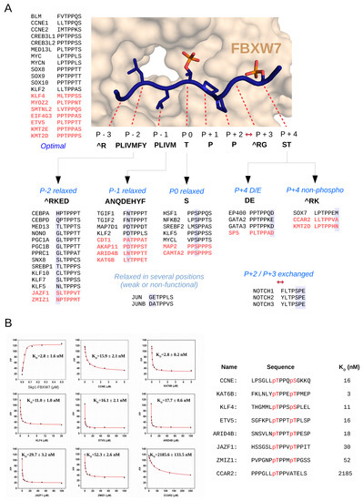 Newly identified phosphodegrons bind to FBXW7 with nanomolar affinity. (A) The scheme of the position–relaxation model describing FBXW7 binding phosphodegron motifs. The structural panel shows the crystal structure of the FBXW7(WD40)-CCNE peptide complex (PDB ID: 2OVQ) highlighting the different motif positions (from P − 3 to P + 4). The optimal sequence pattern, shown in the middle, was defined based on the analysis shown on Figure 2. Motifs with a relaxed position, namely with a sub-optimal amino acid, are shown below. The motif sequence newly identified in this study are shown in red, while known motifs are shown in black; motifs are listed according to the different position–relaxation model classes (see Supplementary Table S2). Note that motifs that deviate from the optimal pattern in more than one position may still bind, albeit with weaker affinity (e.g., JUN and JUNB). (B) Results of quantitative protein–peptide binding assays based on measuring fluorescence polarization. The first panel shows the result of the direct titration experiment with the fluorescently labeled CCNE peptide and increasing amounts of the Skp1-FBXW7 complex. Further panels show the results of competitive binding experiments where the binding of the fluorescently labeled CCNE peptide was competed off by different unlabeled peptides shown on the right (pT: phosphor-threonine and pS: phosphor-serine).
