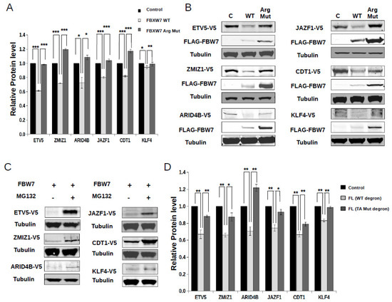 Next, we selected 6 of the 19 new phosphodegron motifs (see Figure 2C) and addressed how they would function in their full-length protein context. ETS translocation variant 5 (ETV5) and Krueppel-like factor 4 (KLF4) are transcription factors [34,35]. CDT1 is a DNA replication factor [36]. Zinc finger MIZ domain-containing protein 1 (ZMIZ1) is a transcriptional co-activator of some of the NOTCH1 target genes (e.g., MYC) [37]. Juxtaposed with another zinc finger protein 1 (JAZF1) and AT-rich interactive domain-containing protein 4B (ARID4B) are transcriptional corepressors [38,39]. The cDNA of full-length KLF4, ETV5, ARID4B, CDT1, ZMIZ1, and JAZF1 were cloned into the DsRed-EGFP-chimera plasmid. HEK293T cells were transfected with these constructs and protein levels were measured by the DsRed/EGFP ratiometric protein level monitoring method in control cells and in cells co-transfected with an intact (WT) or a phosphodegron-binding deficient version of FBXW7 (Arg Mut: three arginine residues in the WD40 domain indispensable for phosphopeptide binding were mutated to amino acids occurring in cancer-associated mutant versions of the protein: R465C; R479Q; R505L). All six constructs showed significant FBXW7-mediated degradation, which required an intact WD40-phosphodegron binding interface (Figure 4A). These results were also qualitatively confirmed by western blots (Figure 4B). Moreover, MG132 counteracted the effect of FBXW7, and protein levels showed a relative increase in the presence of this proteosomal inhibitor indicating that the observed protein level decrease in the presence of FBXW7 depends on proteosome mediated degradation (Figure 4C). Finally, when the two phosphorylatable residues (in P0 and P + 4) were replaced to alanines (TA Mut) FBXW7-mediated degradation was not observed, indicating that mutations of these phosphosites in the FBXW7 client proteins—similarly to the arginine mutations in the WD40 domain of FBXW7—are also deleterious to protein degradation as expected (Figure 4D). In conclusion, these experiments showed that the new phosphodegron motifs identified in the earlier described screen using artificial reporters are also functional in their full-length protein context and may govern the degradation of intact proteins with physiologically diverse functions.