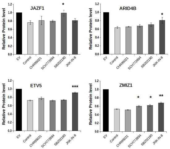 GSK3 was earlier shown to affect the degradation rate of many known FBXW7 client proteins [40]. In order to test if the degradation of the new full-length constructs can be affected by this constitutively active kinase, we used a GSK3-specific inhibitor (CHR99021) but found no effect of this compound in the ratiometric protein level monitoring assay [15]. In contrast to this finding, MAPK-specific inhibitors (ERK1/2—SCH772984, p38—SB202190, and JNK—JNK-IN-8) had a significant effect on FBXW7-mediated protein degradation in four cases out of six full-length targets tested [22,41,42]. Notably, the degradation of JAZF1 was lower in the presence of the p38-specific inhibitor, the JNK-specific inhibitor had a significant effect on ARID4B and ETV5 levels, while ZMIZ1 level was affected by all three MAPK inhibitors (Figure 5). The effects of MAPK inhibitors were modest in most cases, possibly because other kinases are also active on these phosphodegrons. Notwithstanding, the data suggest that certain MAPKs may specifically be involved in the protein level regulation of ZMIZ1, ARID4B, ETV5, and JAZF1 by regulating recognition by FBXW7.