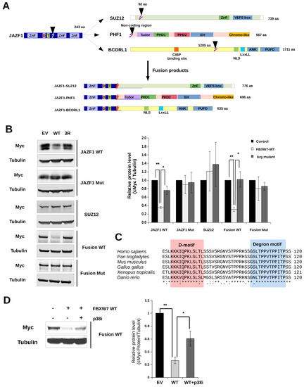 Regulation of JAZF1-SUZ12 fusion protein level by p38-FBXW7 partnership. (A) Scheme of JAZF1 fusions known to be associated with endometrial stromal sarcoma. (B) Western blot analysis of HEK293T cells transfected with Myc-tagged JAZF1 wild-type (WT), JAZF1 Mut (phosphodegron mutant), SUZ12, JAZF1-SUZ12 “wild-type” fusion (Fusion WT), and JAZF1-SUZ12 fusion with phosphodegron mutations (Fusion Mut). EV: cells co-transfected with empty vector; WT: cells co-transfected with wild-type FBXW7; Arg Mut: cells co-transfected with FBXW7 mutated at three arginine positions to eliminate WD40 domain-phosphodegron binding. The bar graph on the right shows the quantification of the western blot (WB) signal calculated based on three independent experiments. Relative protein level was calculated based on the ratio of Myc-protein and Tubulin WB signals and this value was normalized to that of cells transfected with the empty vector (EV). Error bars show SD based on three independent experiments. Statistical significance was calculated based on two-tailed, paired Student’s t-test (*: p < 0.05; **: p < 0.01). (C) Multiple sequence alignment of JAZF1 regions from human, mouse, chicken, a frog (Xenopus tropicalis), and a fish (Danio rerio). The FBXW7 binding degron region and the N-terminally located MAPK-binding D-motif is boxed. (D) Western blot analysis of cells co-transfected with JAZF1-SUZ12 fusion (Fusion WT) and FBXW7 in the absence or presence of a p38-specific inhibitor (2 µM; p38i: SB202190). A representative anti-Myc and anti-Tubulin WB is shown on the left (-FBXW7 refers to EV where cells were not transfected with an FBXW7 containing expression vector, only with an empty vector). The right panel shows that FBXW7 co-expression greatly decreases the protein level of Fusion WT, which is counteracted by the kinase inhibitor. Error bars show SD based on three independent experiments. Statistical significance was calculated based on two-tailed, paired Student’s t-test (*: p < 0.05; **: p < 0.01).