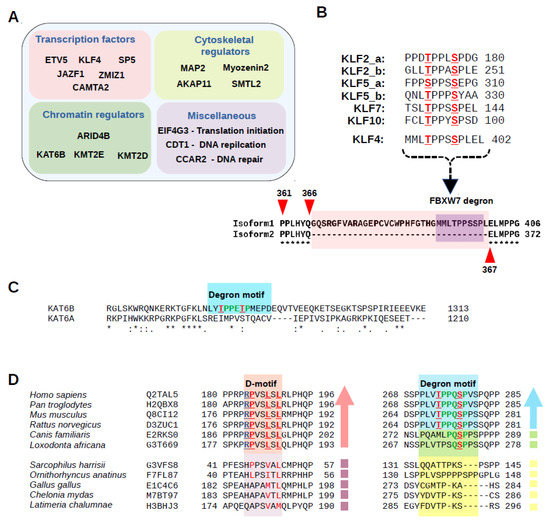 Sequence analysis of proteins containing experimentally validated phosphodegrons. (A) New experimentally tested FBXW7 phosphodegron motifs located in the disordered region of the proteins are classified into different categories based on their functionality: transcription factors, chromatin regulators, cytoskeletal regulation, and some other proteins with miscellaneous functions. (B) Sequence alignment showing phosphodegron motifs of the 5 KLF family members. The most studied isoform of KLF4 lacks a small region (34 aa) including the FBXW7 phosphodegron motif. (C) Alignment of KAT6B and KAT6A showing that evolutionary conserved FBXW7 phosphodegron motif is present in KAT6B but is absent in its paralog KAT6A (* indicates conserved positions). (D) Sequence analysis of the SMTL2 protein hints on the co-evolution of a MAPK binding docking motif and the FBXW7 binding phosphodegron motif.