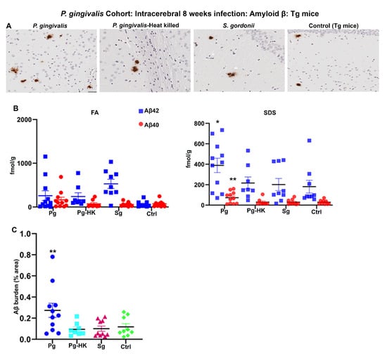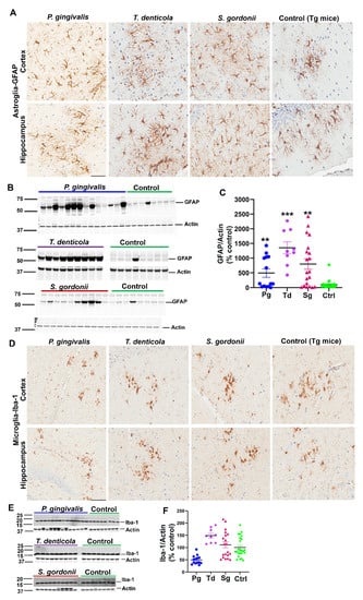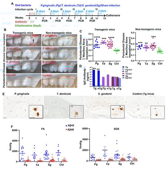 - Ilievski, V.; Zuchowska, P.K.; Green, S.J.; Toth, P.T.; Ragozzino, M.E.; Le, K.; Aljewari, H.W.; O’Brien-Simpson, N.M.; Reynolds, E.C.; Watanabe, K. Chronic oral application of a periodontal pathogen results in brain inflammation, neurodegeneration and amyloid beta production in wild type mice. PLoS ONE 2018, 13, e0204941. [Google Scholar] [CrossRef] [PubMed] [Green Version]
