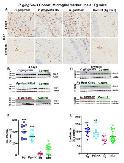 2.2. Intracerebral Infection of P. gingivalis Exacerbates Aβ Deposition and Microgliosis but Does Not Induce Astrogliosis in Tg Mice