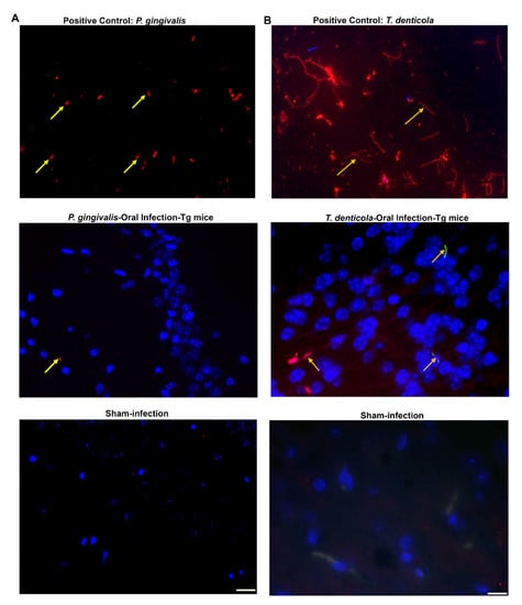 2.4. Demonstration of P. gingivalis Gingipain Protease in Oral and Intracerebral-Infected Mice Brains and T. denticola in Gingival Infected Mice Brains