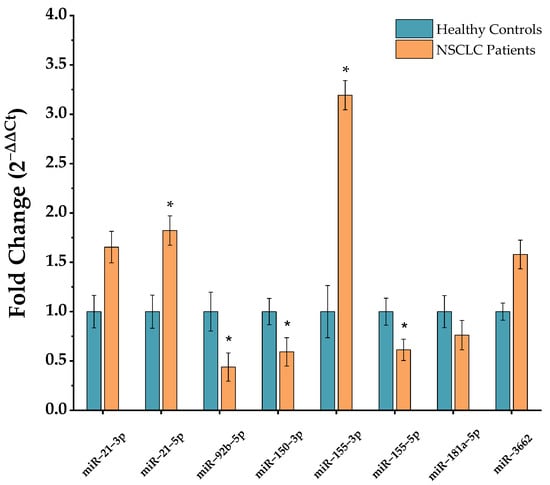 Selected-miRNA relative expression in NSCLC and healthy control PBMCs. Data were normalized to housekeeping miRNAs 103a-3p and 191-5p, and further NSCLC miRNA expression calculated relatively to a healthy control expression value of 1 (mean ± SD, * p < 0.05). Data population after outlier exclusion for multiple miRNAs was: miR-21-3p (control n = 19, NSCLC n = 23); miR-21-5p (control n = 21, NSCLC n = 50); miR-92b-5p (control n = 20, NSCLC n = 45); miR-150-3p (control n = 19, NSCLC n = 45); miR-155-3p (control n = 20; NSCLC n = 45); miR-155-5p (control n = 12; NSCLC n = 21); miR-181a-5p (control n = 10, NSCLC n = 18); and miR-3662 (control n = 10; NSCLC n = 18).