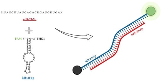 Hybridization kinetics and dynamics were studied for the designed MB 21-5p targeting miR-21-5p. MB 21-5p design comprised a stem region coupled with a donor-quencher pair (5′-FAM and BHQ1-3′) and a loop region corresponding to the miR-21-5p reverse complementary sequence. Upon structure software simulations, MB 21-5p folding configuration displayed both the stem and the loop region, with a shorter stem at the top of the loop region, resulting from base complementarity inner bonding on the miR-21-5p specific complementary sequence (Figure 2).