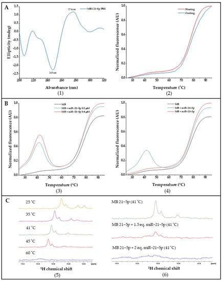 Next, NMR spectroscopy was performed to check the hybridization of MB 21-5p with miR-21-5p target. MB 21-5p 1H NMR spectra revealed specific Watson-Crick GC base pairing signals at 13 ppm related with the MB 21-5p stem region formed in the MB signature hairpin folded configuration. A temperature increase led to a signal reduction and further vanishing at 60 °C, characteristic of the stem region breakdown and MB unfold (Figure 3C(5)). In Figure 3C(6), the imino signal disappearance is visible with the addition of the specific miR-21-5p target to MB 21-5p.