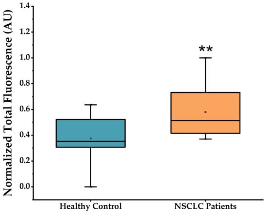 Figure 4 represents the fluorescence signal arising from MB 21-5p in PBMCs from patients and control clinical samples. A significant higher fluorescence is visible in NSCLC PBMC samples compared to controls. This is in total agreement with the overexpression profile of miR-21-5p over-expressed profile in NSCLC characterized by RT-qPCR (see above). MB 21-5p miR-21-5p detection robustness was measured via ROC curve analysis, in which the developed method was able to discriminate between NSCLC patients with 100% sensitivity (true positives) and 55.3% specificity (true negatives) (Figure S5). By excluding NSCLC stage IV patients, the MB 21-5p developed approach exhibited a higher fluorescence proclivity for NSCLC PBMCs in stages I, II and III, compared to healthy volunteers, while still being capable of identifying true positive cases with 100% sensitivity and true negative cases with 55.3% specificity (Figures S6 and S7).