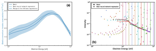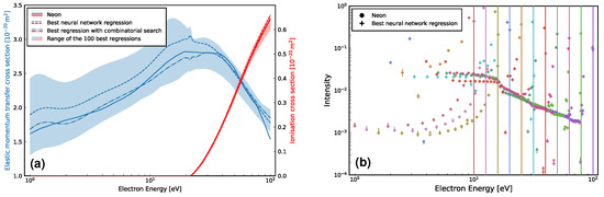 Simultaneous neural network regression of Ne’s elastic MTCS and ionisation cross-sections [90], (a), and the corresponding agreement, (b), between its simulated EELS and the EELS used to perform the fit. The vertical lines in (b) denote the initial energies for each of the eleven EELS considered (from to incident energy, inclusive). Additionally, a shaded area in (a), along with vertical error bars in (b), are provided to indicate the range of the 100 best regressions. See also the figure legends for further details, noting that black is used to represent each colour of that marker shape, where colours correspond to each initial electron energy of 100, 79.43, 63.1, 50.12, 39.81, 31.62, 25.12, 19.95, 15.85, , and , indicated by vertical lines. In this model, a bias vector size of 128 was used along with 300,000 iterations.