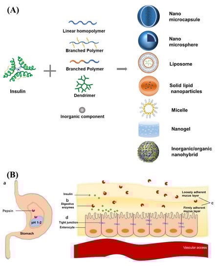 In the past 20 years, the combination of nanotechnology and pharmaceutics has brought possibility for the realization of oral administration of macromolecular drugs [36,37,38], and it is also a promising research direction of oral insulin [39,40]. In this review, we summarize the physiological absorption barriers of oral insulin and discuss the nano-drug delivery systems constructed from different materials (Figure 1). The bioavailability of oral administration of insulin is being enhanced by various types of strategies to construct different delivery nanosystems. Finally, the future research tendency for the further improvement of bioavailability is addressed.