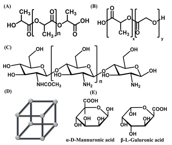 The chemical structures of the carrier materials for oral insulin delivery nanosystems. (A) PLA, (B) PLGA, (C) chitosan, (D) MOFs, and (E) alginate acid.