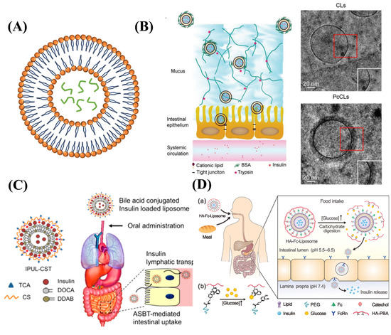 (A) The structure of liposomes. (B) TEM images of CLs and PcCLs, and schematic diagram for the process of the transport of the PcCLs through the mucus layers and epithelial barrier. (C) Schematic diagram of IPUL-CST and its intestinal uptake and lymphatic transport. (D) Schematic representation of the glucose-responsive oral insulin delivery liposomes for postprandial glycemic regulation.