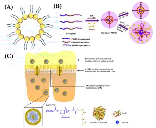 (A) Structure of micelles. (B) Schematic representation of Ins-loaded PCPMs and its pH-triggered release. (C) Schematic representation of DSPE-PCB micelles for oral delivery of insulin.