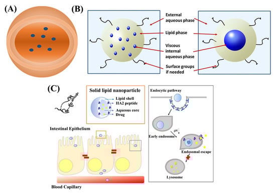 Boushra et al. prepared SLN from soy lecithin. Viscosity-enhanced nanocarriers (VEN) were developed by adding a hydrophilic viscosity enhancer (VA) to the SLN core, which solved the problem of low encapsulation efficiency of hydrophilic active substances by SLN (Figure 5B) [125]. Oral insulin VEN showed good hypoglycemic effect in fasted rats with a relative bioavailability of 5.1%. Xu et al. prepared solid nanoliposomes with a shell containing endosomal escape factor hemagglutinin-2 peptide (HA2) by ultrasonication, which consisted of a soy lecithin solid lipid shell and an aqueous nucleus containing insulin [30]. The shell containing HA2 could effectively avoid lysosomal degradation of epithelial cells, the accumulation of insulin in the basolateral side of epithelial cells was much greater than that of free insulin, and the biological activity of insulin was maintained to a greater extent during intracellular transport (Figure 5C). SLN has better stability and simpler preparation method compared with liposomes. However, the encapsulation efficiency of hydrophilic drug insulin is still low. The development of oral insulin preparations still needs to be further studied.