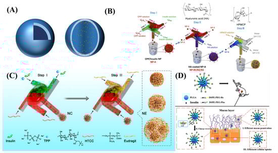 (A) Structures of organic nanospheres/nanocapsules. (B) Schematic representation of sequential FNC platform for preparation of the CPP/insulin nanoparticles. (C) The structure and the preparation process of NC-HTCC. (D) The structure of virus-like P-R8-Pho NPs and diagram of P-R8-Pho NPs to sequentially overcome mucus layer and intestinal epithelial cell layer.