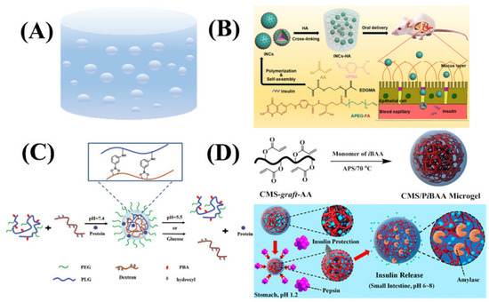 Li et al. used the pH-sensitive monomer, ethylene glycol dimethacrylate (EGDMA), and the glucose-sensitive monomer, 4-vinylbenzeneboronic acid (VPBA), as materials to synthesize smart responsive nanogels of approximately 200 nm by microemulsion radical polymerization (Figure 7B) [134]. As the glucose concentration increased, hydrophilic phenylboronic acid–glucose complexes were formed, and the hydrogel size increased. Under the pH condition of the small intestine, the carboxyl group of acrylic acid lost its protons, which led to electrostatic repulsion between polymer chains. Nanogel produced a sparse gel structure and eventually released insulin from the nanoscale carrier. The system was further modified with polyethylene glycol–folic acid, which targeted the folate receptor on epithelial cells and promoted the penetration of the nanogel through receptor-mediated endocytosis. The hypoglycemic effect was verified in animal experiments. Si et al. developed a novel nanogel system with a particle size of approximately 44 nm based on poly (L-glutamic acid)-g-methoxypoly (ethylene glycol)/aminophenylboronic acid (PLG-g-mPEG/PBA) and dextran (Figure 7C) [133]. The nanogel was constructed through the reversible reaction of boron ester bonds between cis-diol on dextran and phenylboronic acid in PLG-g-mPEG/PBA, and insulin was loaded into the cross-linked lattice during the formation process. Since the boron ester bond broke at high glucose concentrations and weak acid environment, the prepared protein-loaded nanogels had good stability under normal physiological environments and could rapidly release insulin in weak acid and high glucose environments. It also had dual pH and glucose sensitivity. Effective endocytosis of the nanogels by cells could be observed by fluorescent imaging through confocal microscopy. Liu et al. used acrylic acid-grafted carboxymethyl starch (CMS-g-AA) and 2-isobutyl acrylate (iBAA) as monomers to prepare nanogels with a particle size of about 400 nm by aqueous dispersion copolymerization and loaded insulin into them by solubilization diffusion [41]. The system was pH-sensitive, with a mutation of ionization–deionization around pH 6.0 in the pKa value of iBAA, which conferred pH sensitivity to the material (Figure 7D). The accelerated breakdown of CMS-containing nanogels by amylase was confirmed by color development reactions and morphological changes, so that intestine-enriched alpha-amylase could degrade CMS to further accelerate insulin release in the intestine. This kind of nanomaterials could promote transmembrane transport of insulin into Caco-2 cells and enhance the oral pharmacological bioavailability of insulin.